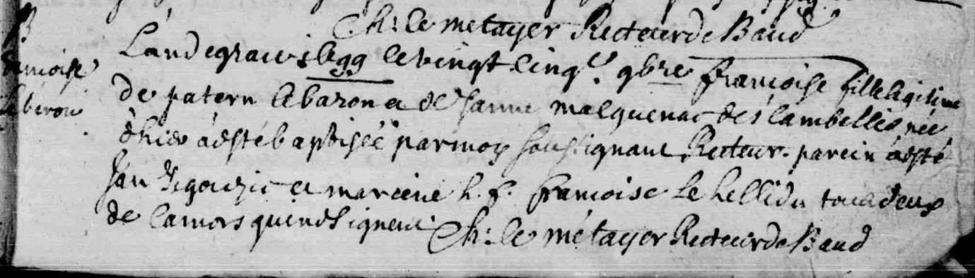 | Baptême BARON (LE) Françoise - 1699 - Baud |