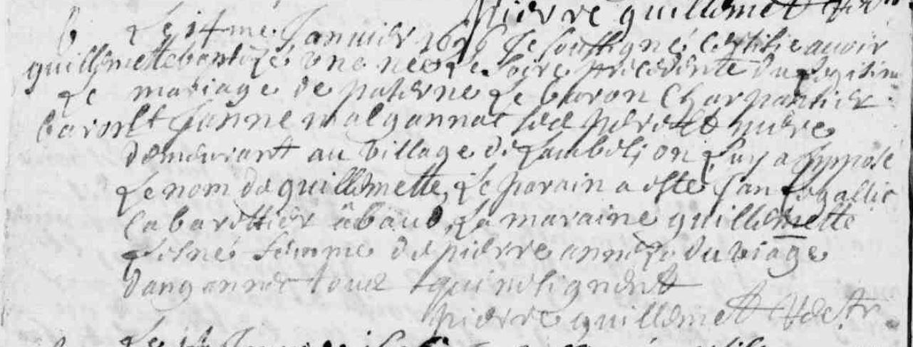 | Baptême BARON (LE) Guillemette - 1696 - Camors |