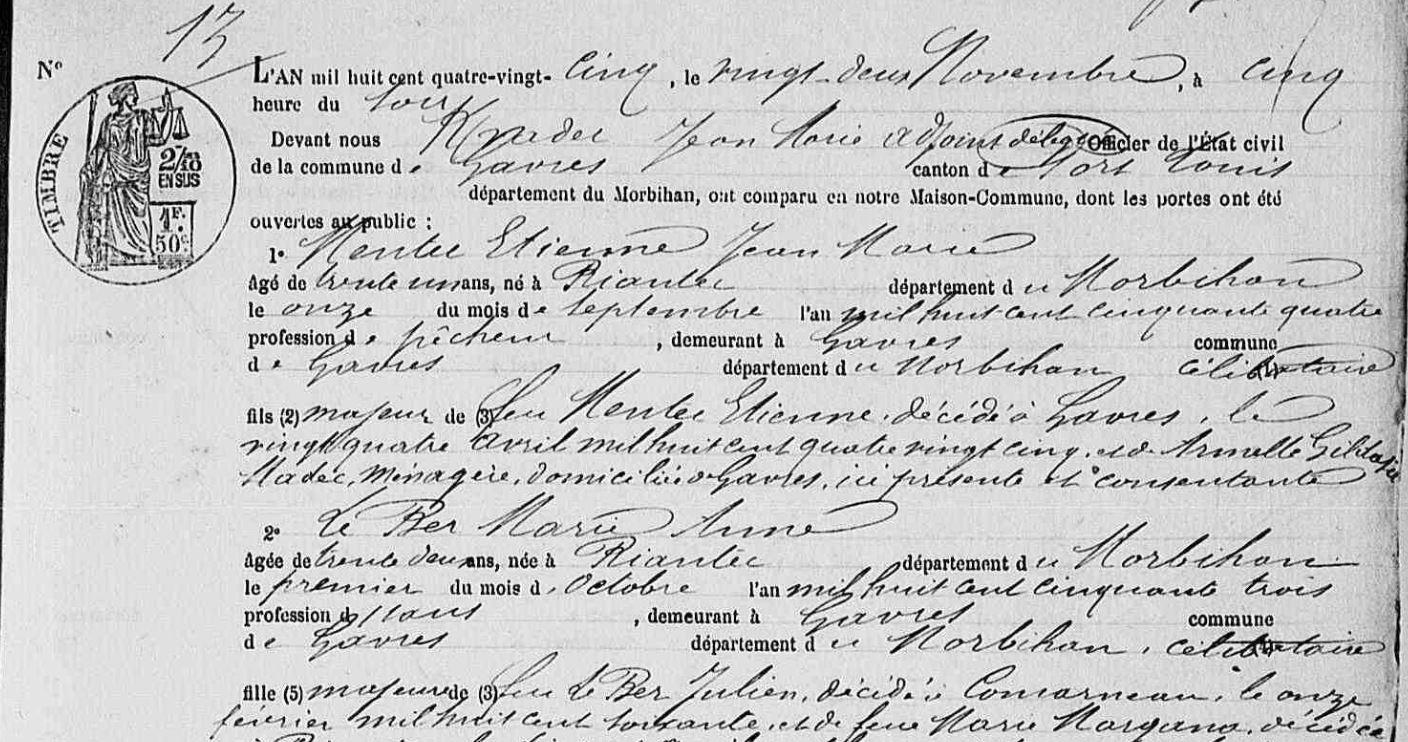 Mariage MENTEC Etienne Jean Marie BER (LE) Marie Anne - 1885 - Gâvres - 1 |