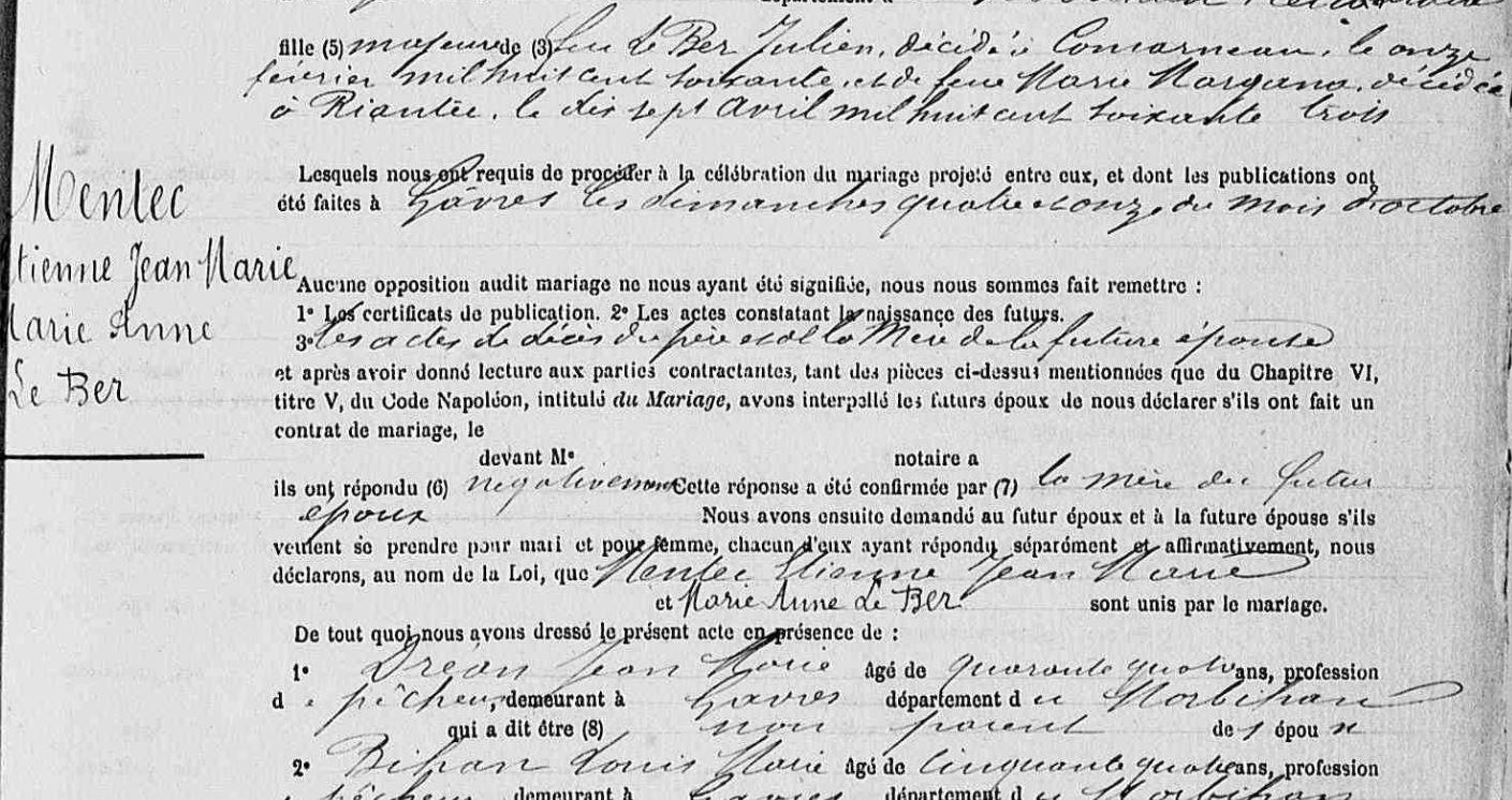 Mariage MENTEC Etienne Jean Marie BER (LE) Marie Anne - 1885 - Gâvres - 3 |