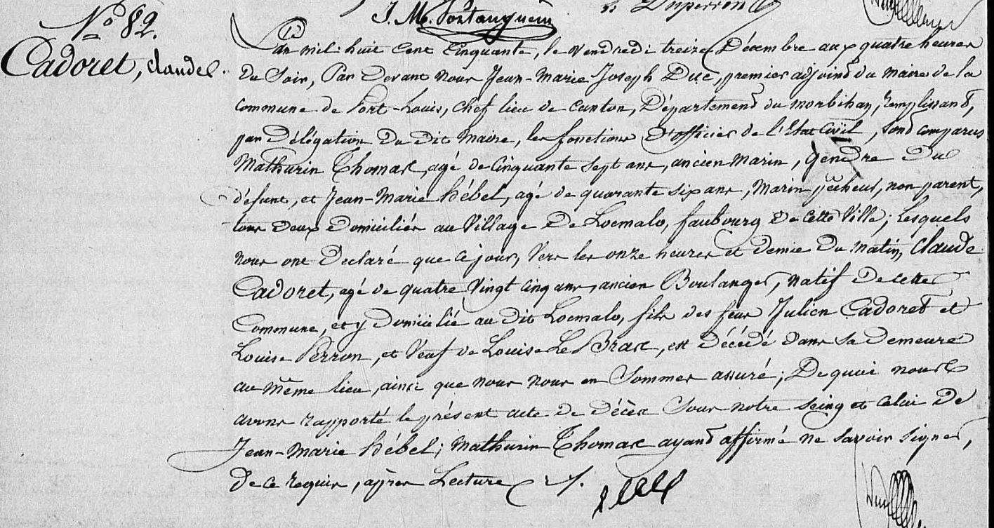 | 1. CADORET Claude Naissance : Date : 22/09/1765 Lieu : Port-Louis (56) Union : Date : 23/01/1786 Lieu : Port-Louis (56) avec BRAS (LE) Louise. Décès : Date : 13/12/1850 Lieu : Port-Louis (56), Locmalo à l'âge de 85 ans. |