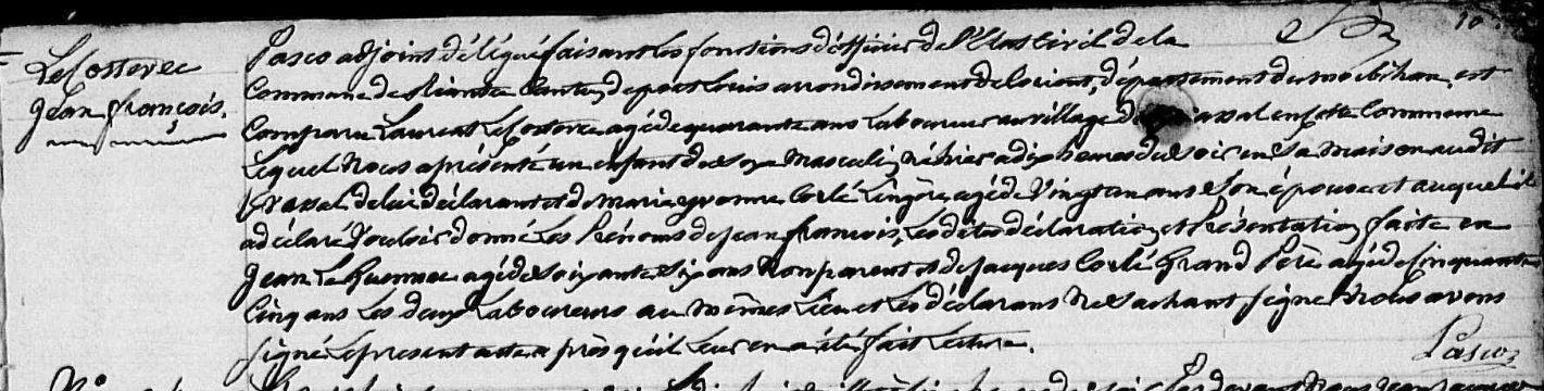 | Il voit le jour 01/11/1750 à Plouhinec (56). Père : COSTEVEC (LE) Michel, Sosa 384 Naissance : 1 Date : 15/02/1719 Lieu : Kervignac (56) Décès : 2 Date : 19/12/1796 Lieu : Plouhinec (56) à l'âge de 77 ans. Mère : TALLEC (LE) Françoise, Sosa 385 Naissance : Date : 23/08/1728 Lieu : Plouhinec (56) Décès : Date : 01/12/1800 Lieu : Plouhinec (56) à l'âge de 72 ans. A sa naissance, ses père et mère étaient âgés de 31 ans et 22 ans. |