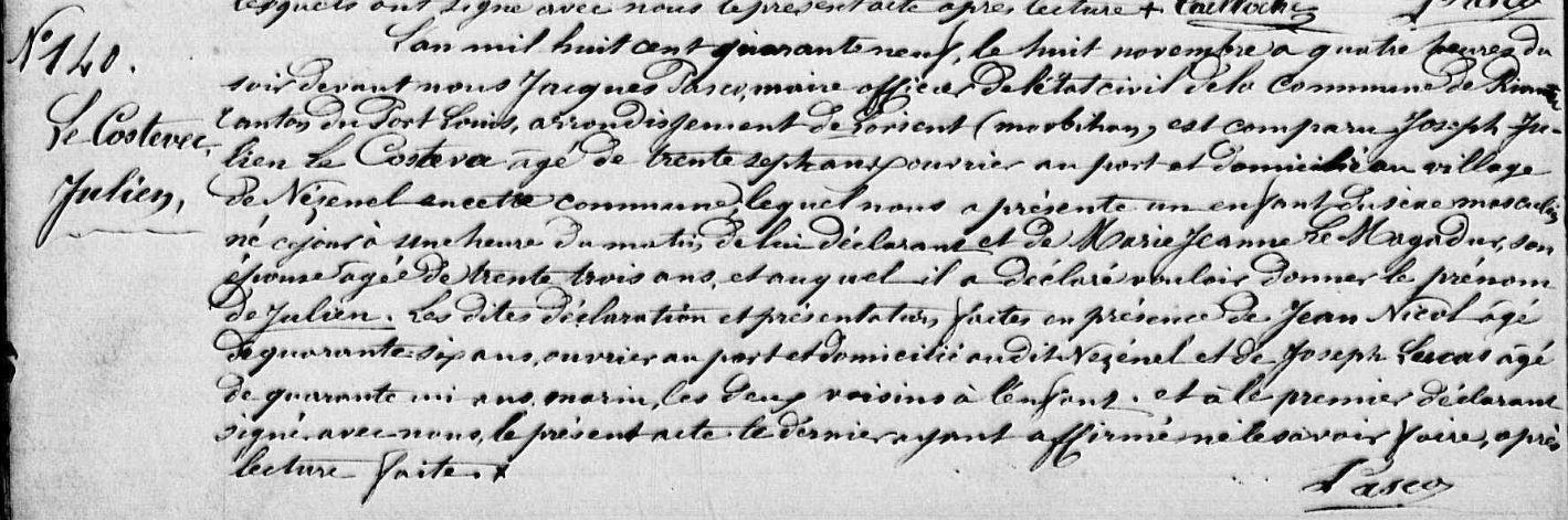 | Naissance COSTEVEC (LE) Julien - 1846 - Riantec |