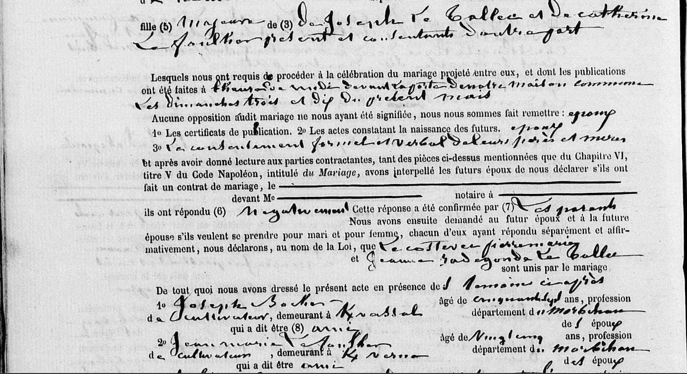 | Mariage : Date : 19/01/1875 Lieu : Riantec (56) TALLEC (LE) Jeanne Radegonde, Cultivatrice Elle naît à Kervignac (56) . |