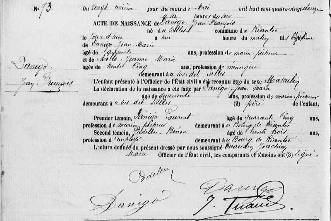 | Naissance DANIGO Jean François - 1892 - Riantec |