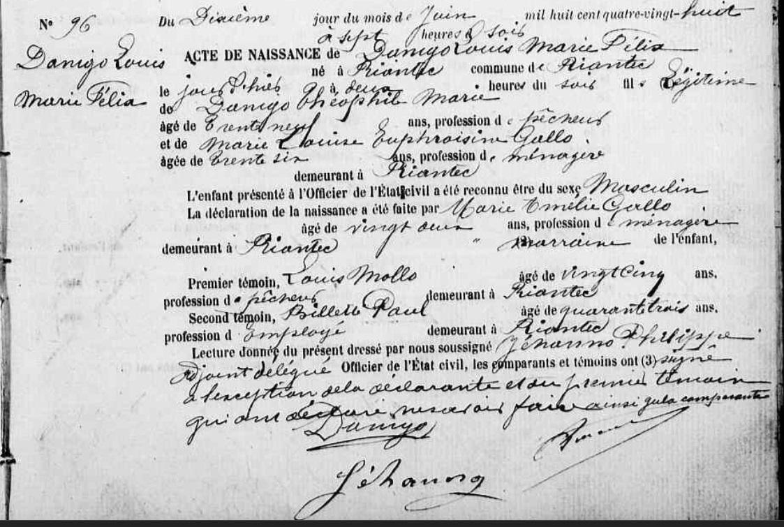 | Il voit le jour à Riantec (56) 09/06/1888. Père : DANIGO Théophile Marie, Sosa 20, Marin Pêcheur Naissance : Date : 10/10/1848 Lieu : Riantec (56), Bourg Décès : Date : 12/04/1920 à moins de 71 ans. Mère : GALLO Marie Louise Euphrosine, Sosa 21, Ménagère - Débitante Naissance : Date : 28/02/1852 Lieu : Riantec (56), Bourg Décès : 1 Date : 19/12/1935 Lieu : Riantec (56) à l'âge de 83 ans. A sa naissance, ses père et mère étaient âgés de 39 ans et 36 ans. |