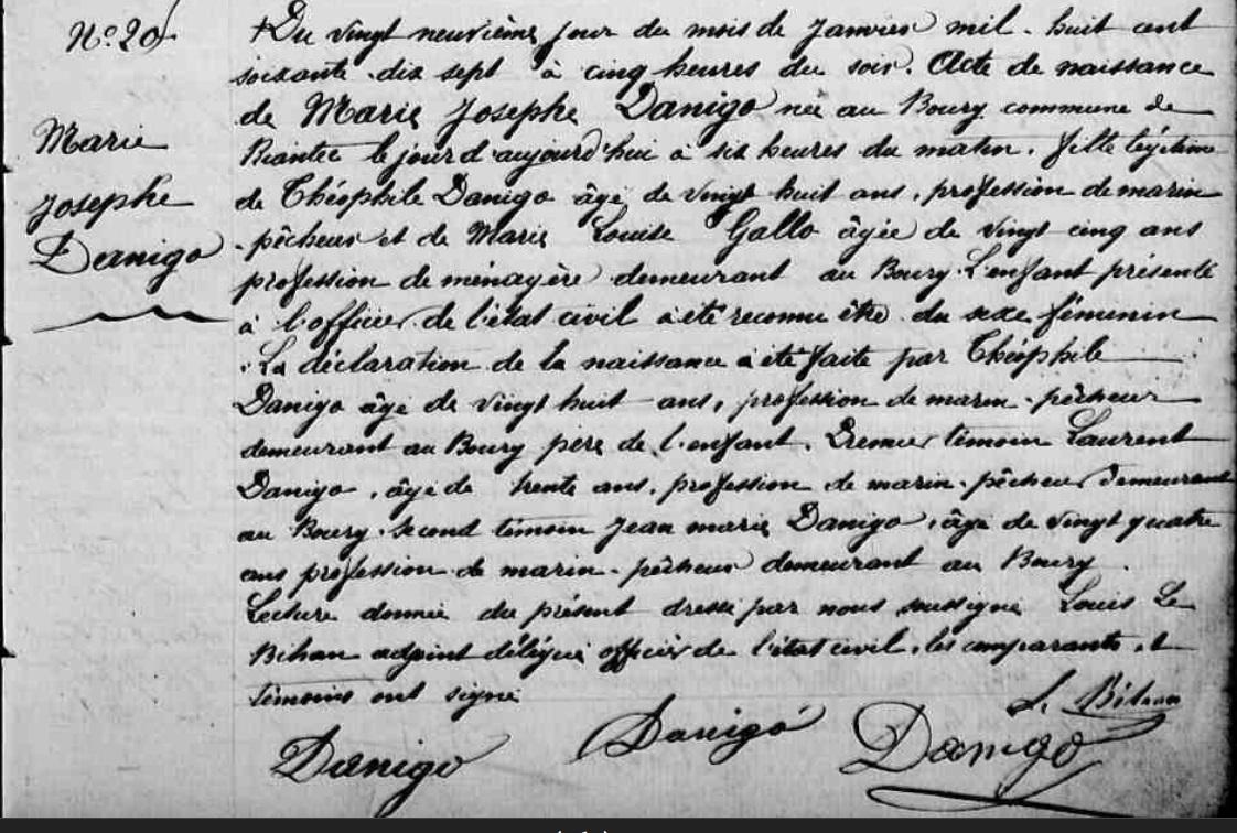| Frère(s) / soeur(s) de DANIGO Jean : - DANIGO Laurent Marie (Naissance : 1847 Décès : 1912) Union 1872 : GOFF (LE) Marie - DANIGO Théophile Marie, Sosa 20 (Naissance : 1848 Décès : 1920) Union 1872 : GALLO Marie - DANIGO Marie Louise (Naissance : 1850) Union 1875 : DANIGO Joseph - DANIGO Mathurin (Naissance : 1852 Décès : 1853) - DANIGO Hélène Marie (Naissance : 1854 Décès : 1854) - DANIGO Marie Eliza (Naissance : 1854 Décès : 1854) - DANIGO Onésime Mathurin (Naissance : 1856) Union 1884 : GALLO Marie |