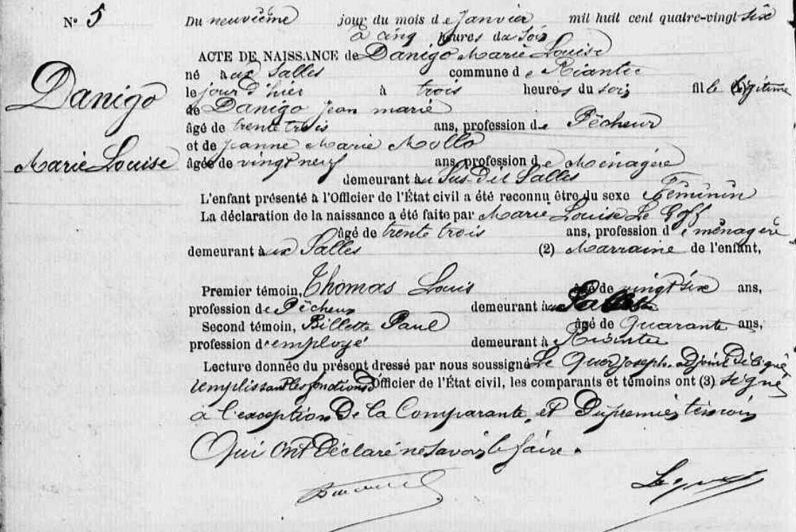 | Elle voit le jour 08/01/1886 à Riantec (56), Les Salles. Père : DANIGO Jean Marie, Marin pêcheur Naissance : Date : 14/06/1852 Lieu : Riantec (56), Bourg Mère : MOLLO Jeanne Marie, Ménagère Naissance : Date : 20/09/1856 Lieu : Riantec (56), Les Salles A sa naissance, ses père et mère étaient âgés de 33 ans et 29 ans. |