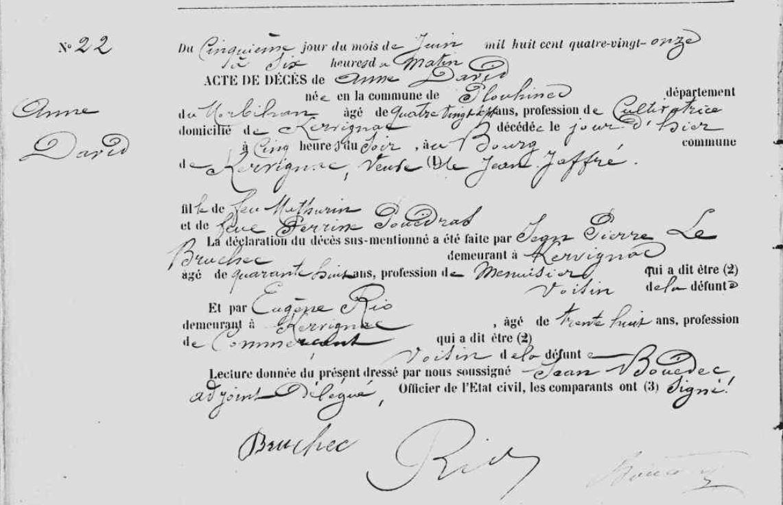 | Elle est née 03/11/1805 à Plouhinec (56). + 04/06/1891 Kervignac (56), Bourg, 87 - - 17:00 - NO à l'âge de 85 ans 1. Signature : Non. Père : DAVID Mathurin, Sosa 202, Laboureur Naissance : Date : 01/02/1767 Lieu : Plouhinec (56) Décès : 2 Date : 27/06/1825 Lieu : Kervignac (56) à l'âge de 58 ans. Mère : POUEDRAS Marie (Perrine), Sosa 203 Naissance : Date : 05/03/1766 Lieu : Languidic (56) Décès : 3 Date : 30/01/1826 Lieu : Kervignac (56) à l'âge de 59 ans. A sa naissance, ses père et mère étaient âgés de 38 ans et 39 ans. |