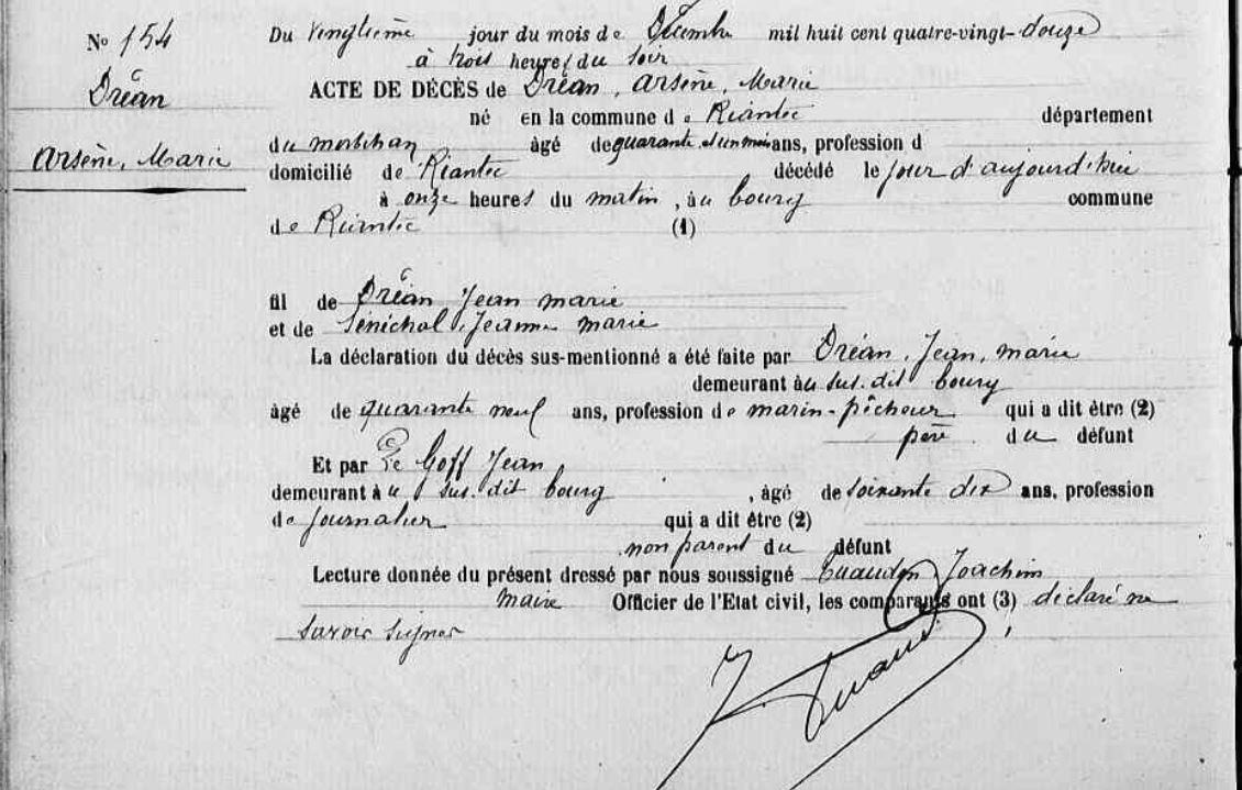Décès DREAN Arsène Marie - 1892 - Riantec |