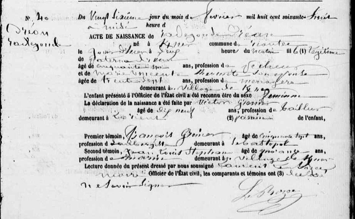 | 1 Note, Décès : Auparavant, noté 25/01/1869 à Riantec. Corrigé par l'acte de Mariage de son fils Vincent avec Radegonde DREAN et aussi par l'acte de Mariage de sa fille Joséphine avec Joseph MARGANA. A vérifier. |