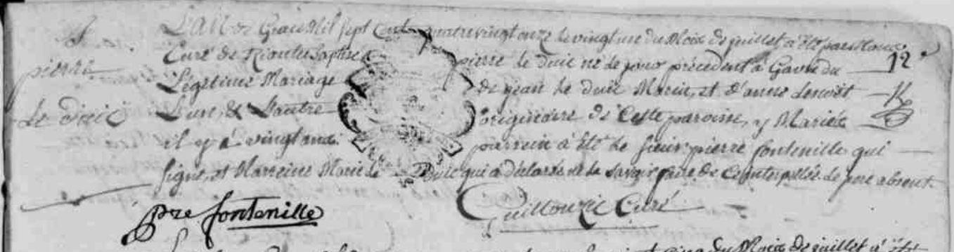 | 7. DUIC (LE) Guillaume, Sosa 534 Naissance : Date : ../../1691 Union : Date : 19/01/1711 Lieu : Riantec (56) avec GAHINET Laurence, Sosa 535. Union : Date : 06/11/1730 Lieu : Riantec (56) avec BIDEAU (LE) Radegonde. Décès : Date : 03/10/1744 Lieu : Riantec (56) à environ 53 ans. |