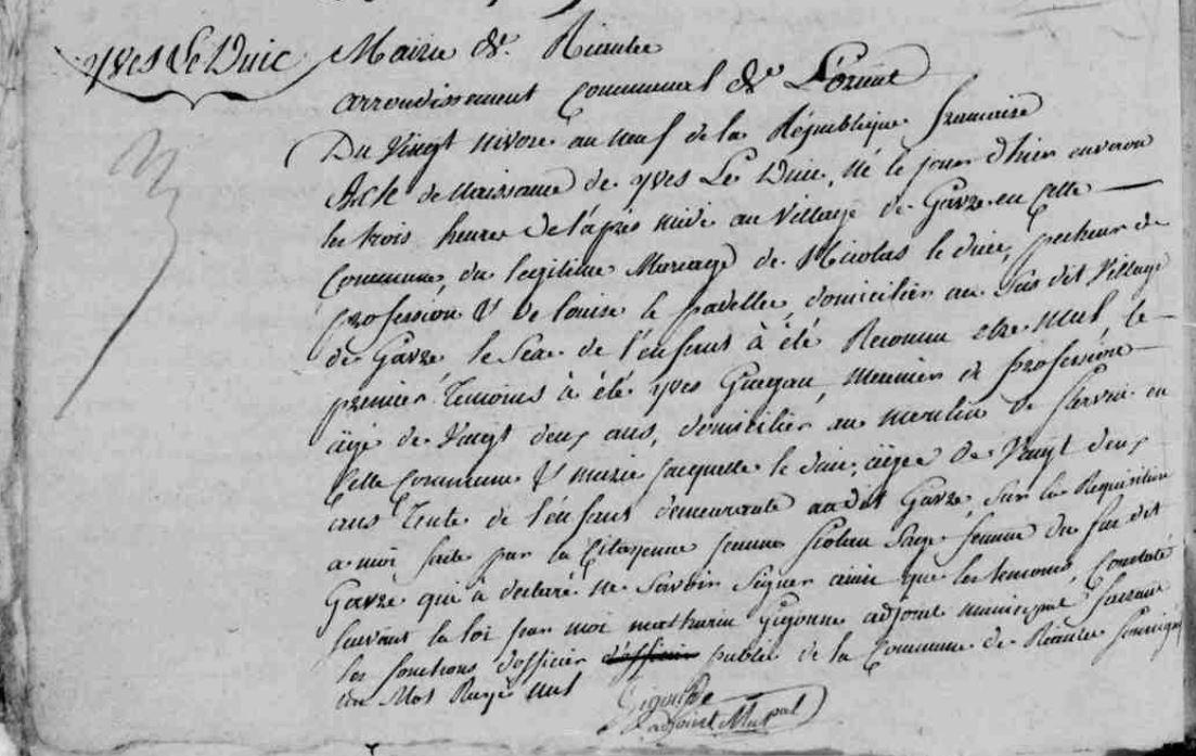 | Il voit le jour 09/01/1801 à Riantec (56), Gâvres. Père : DUIC (LE) Nicolas, Marin pêcheur Naissance : Date : 22/05/1764 Lieu : Riantec (56) Mère : PADELLEC (LE) Louise Naissance : Date : 03/03/1767 Lieu : Riantec (56) Décès : Date : 26/11/1818 Lieu : Riantec (56) à environ 51 ans. A sa naissance, ses père et mère étaient âgés de 36 ans et 33 ans. |