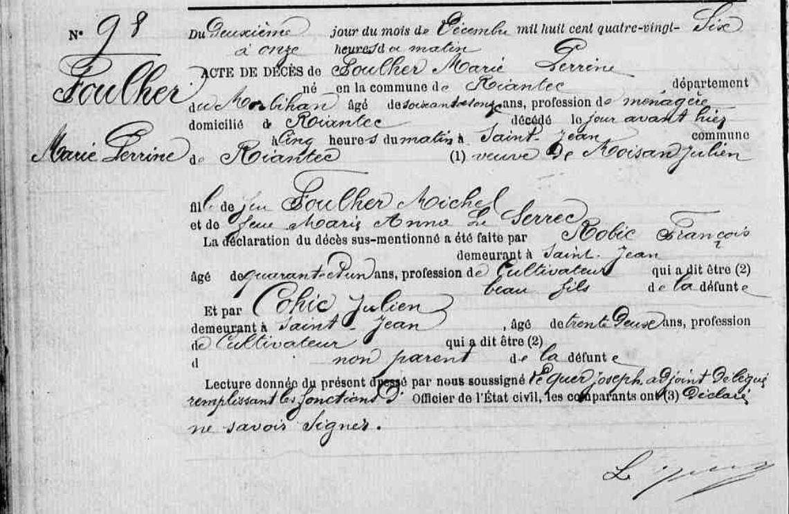 | 8. FOULHER (LE) Marie Perrine Naissance : 8 Date : 14/02/1819 Lieu : Riantec (56) Unie avec MOISAN Julien. Décès : Date : 30/11/1886 Lieu : Riantec (56), Saint Jean à l'âge de 67 ans. |