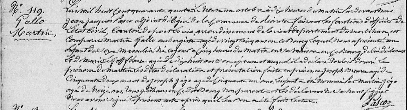 | 2 Note, Naissance : Témoins : Mathieu GULLUDEC (LE), 56 ans, voisin. Jean NEZET (LE), cordonnier au Bourg, 34 ans, non parent. |
