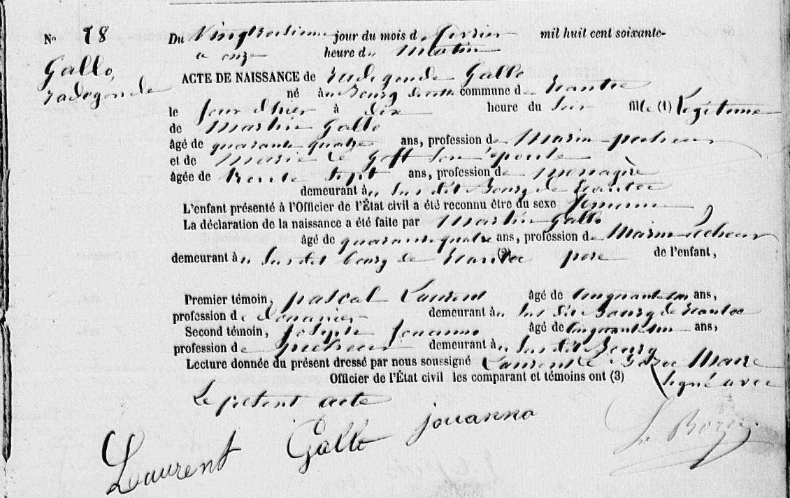 | Elle voit le jour ../../1818. Signature : Non. Père : GALLO (LE) Vincent, Marin pêcheur Naissance : Date : ../../1795 Mère : A sa naissance, son père était âgé de 23 ans. |