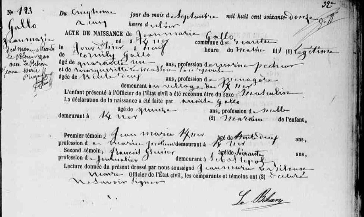 | Il est né à Riantec (56), Kerner 04/09/1872. Père : GALLO (LE) Corneille, Sosa 36, Marin pêcheur Naissance : Date : 30/07/1831 Lieu : Riantec (56) Mère : MASSON (LE) Marguerite Marie, Sosa 37, Cultivatrice - Ménagère Naissance : Date : 01/08/1840 Lieu : Riantec (56), Kerner A sa naissance, ses père et mère étaient âgés de 41 ans et 32 ans. |
