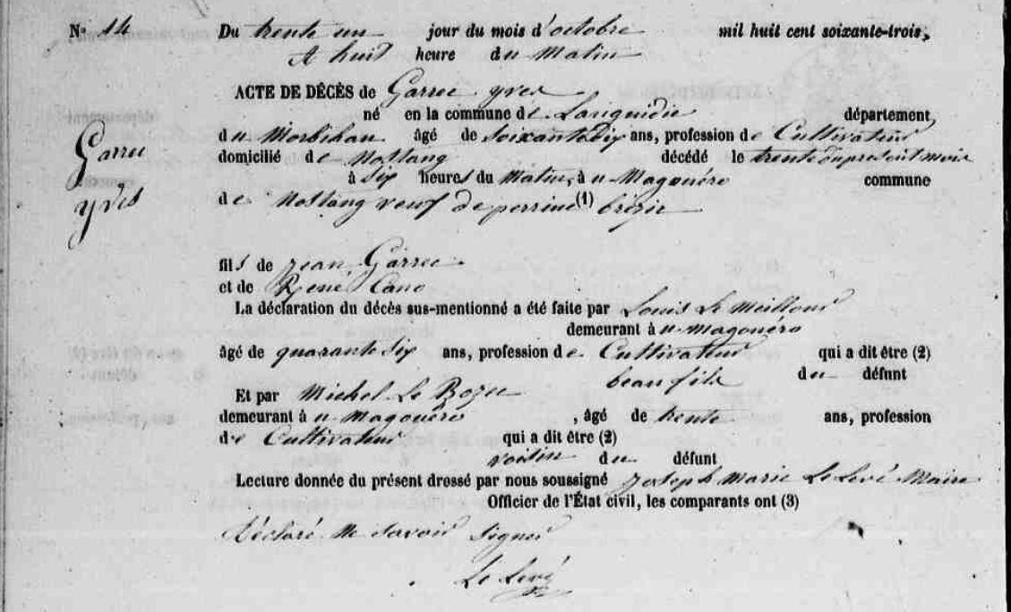 | Décès GARREC Yves - 1863 - Nostang |