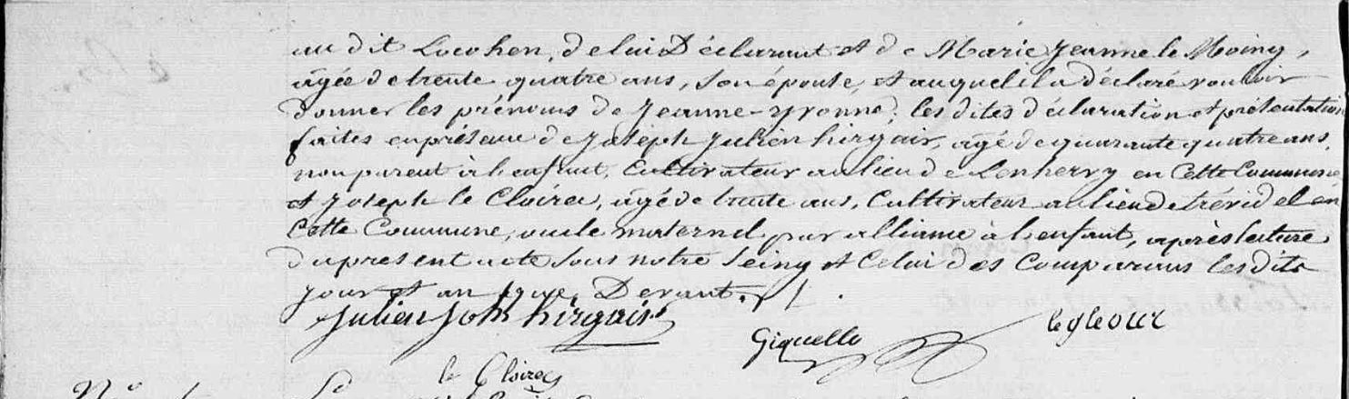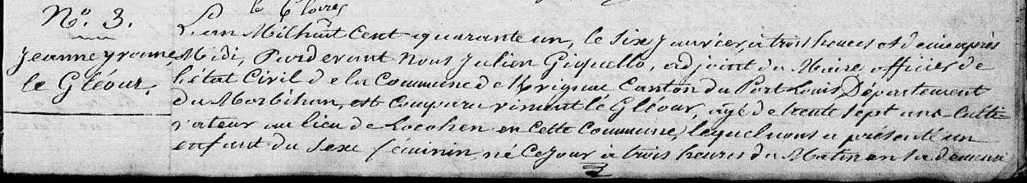 | Elle voit le jour 06/01/1841 à Kervignac (56), Locohen. Signature : Non. Père : GLÉOUR (LE) Vincent, Cultivateur Naissance : Date : ../../1804 Mère : MOING (LE) Marie Jeanne, Cultivatrice Naissance : Date : ../../1807 A sa naissance, ses père et mère étaient âgés de 37 ans et 34 ans. |