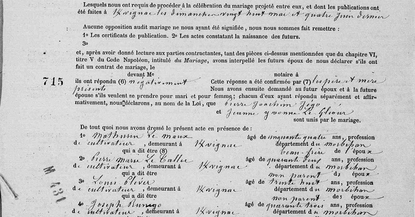 | Mariage JEGO Pierre Joachim GLEOUR (LE) Jeanne Yvonne - 1871 - Kervignac - 3 |