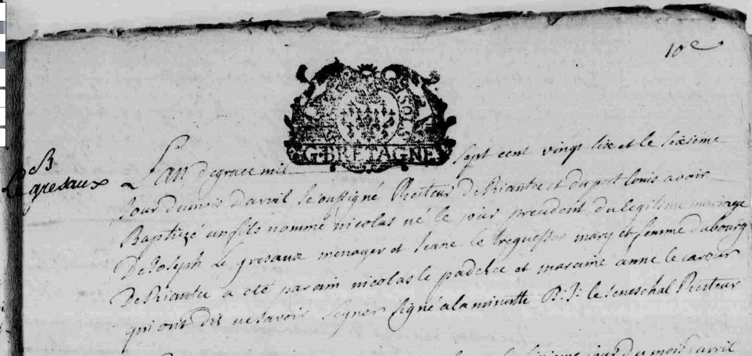 | Baptême GRESAUX (LE) Nicolas - 1726 - Riantec |