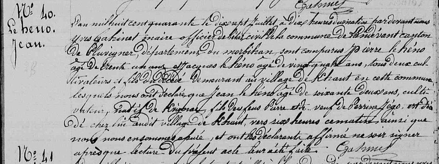 | 1. HENO (LE) Jean Naissance : 1 Date : 10/10/1781 Lieu : Kervignac (56) Union : Date : 11/02/1806 Lieu : Kervignac (56) avec JEGO Perrine. Décès : Date : 17/07/1840 Lieu : Landévant (56), Kerhaut à l'âge de 58 ans. |