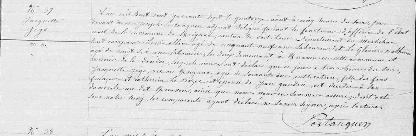 | Elle naît à Riantec (56) 13/12/1757. + 18/12/1828 Riantec (56), - - - NO à l'âge de 71 ans. Signature : Non. Père : JEGO Guillaume Joseph, Sosa 446 Naissance : Date : 19/08/1730 Lieu : Riantec (56) Décès : Date : 02/03/1797 Lieu : Riantec (56) à l'âge de 66 ans. Mère : LAN (LE) Jacquette, Sosa 447 Naissance : Date : 17/06/1726 Lieu : Kervignac (56) Décès : Date : 08/05/1785 Lieu : Riantec (56) à l'âge de 58 ans. A sa naissance, ses père et mère étaient âgés de 27 ans et 31 ans. |