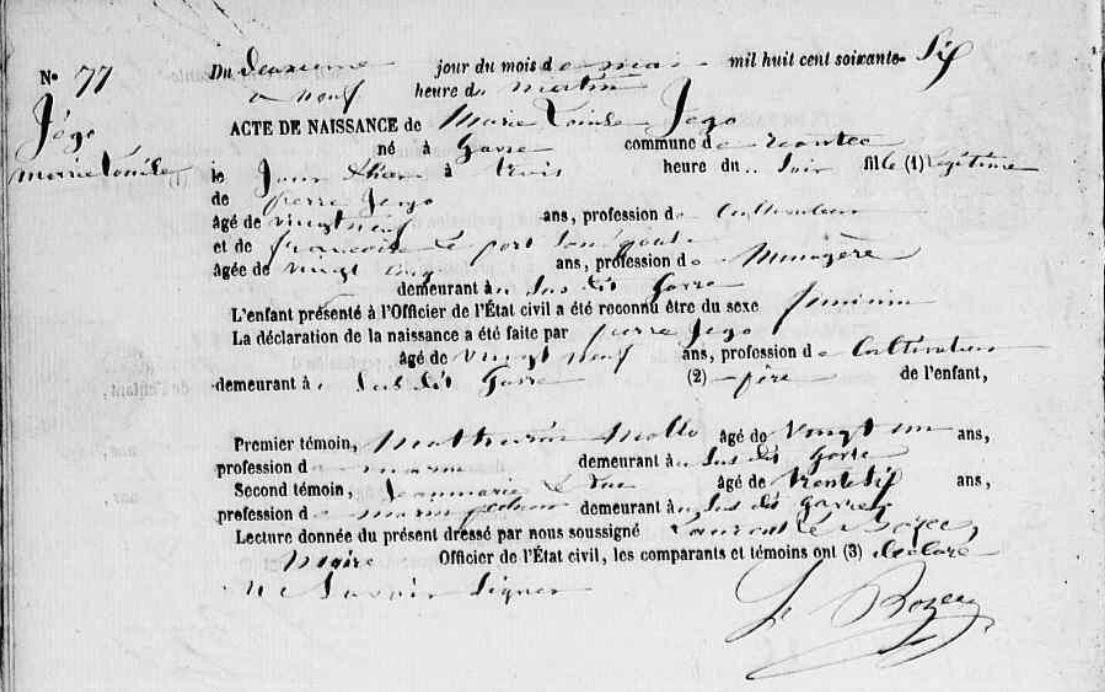 | Elle est née 01/05/1866 à Riantec (56), Gâvres. Signature : Non. Père : JEGO Pierre Marie, Cultivateur - Charretier Naissance : Date : 15/03/1834 Lieu : Belz ? (56) Mère : PORT (LE) Marie Françoise, Ménagère - Cultivatrice Naissance : Date : 30/10/1836 Lieu : Belz (56) A sa naissance, ses père et mère étaient âgés de 32 ans et 29 ans. |