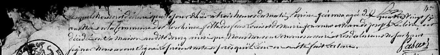 | 3. JEHANNO Louis Naissance : Date : 23/08/1752 Lieu : Landévant (56), Moulin de Frloquen Décès : Date : 28/05/1785 Lieu : Landévant (56), Keraude à l'âge de 32 ans. |