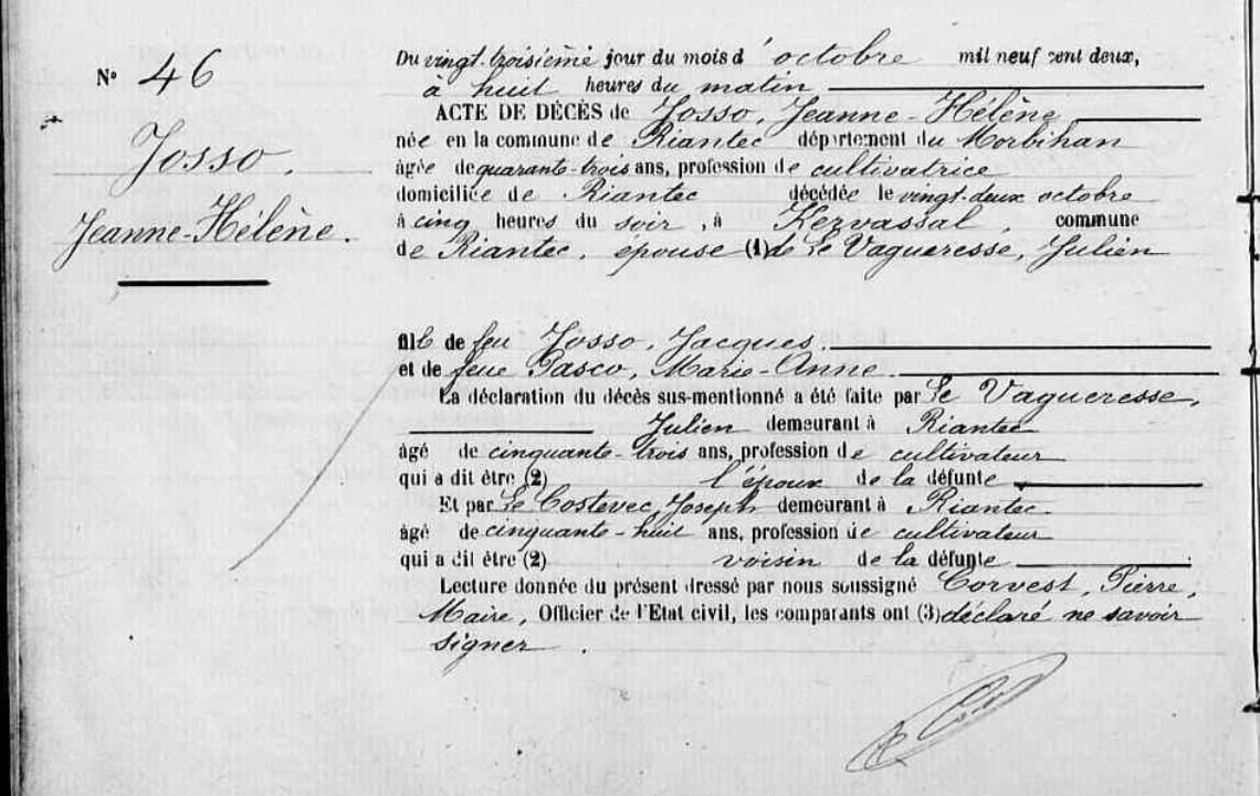 | Elle naît à Riantec (56), Keranquine 20/05/1859. + 22/10/1902 Riantec (56), Kervassal, 37 - - 17:00 - NO à l'âge de 43 ans. Signature : Non. Père : JOSSO Jacques, Sosa 54, Forgeron Naissance : Date : 24/11/1827 Lieu : Kervignac (56), Saint Sterlin Décès : Date : 14/09/1883 Lieu : Riantec (56) à l'âge de 55 ans. Mère : PASCO Marie Anne, Sosa 55, Ménagère - Cultivatrice - Domestique Naissance : Date : 16/04/1828 Lieu : Riantec (56) Décès : Date : 26/01/1895 Lieu : Riantec (56), Nezenel à l'âge de 66 ans. A sa naissance, ses père et mère étaient tous deux âgés de 31 ans. |