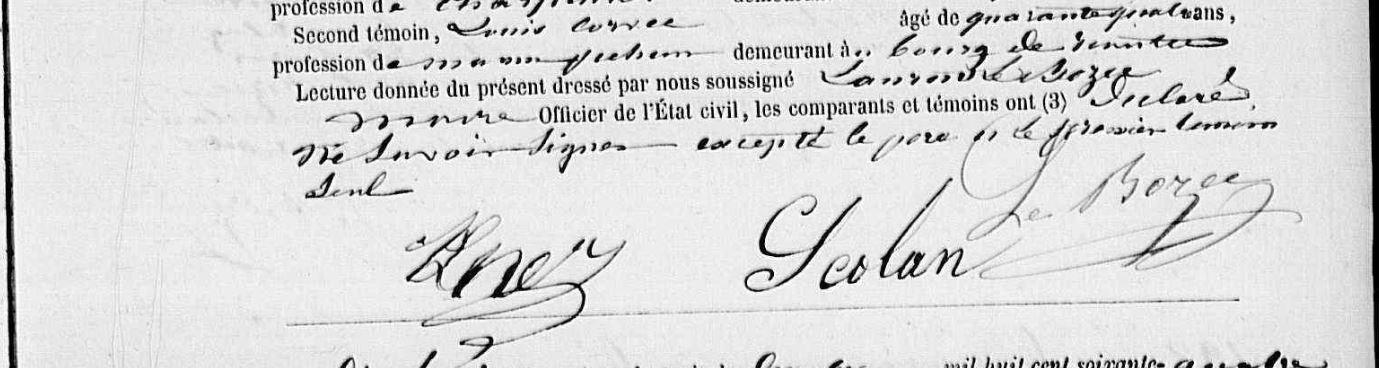 | Elle est née 14/12/1829 à Riantec (56). Signature : Non. Père : KERNER Pierre, Charpentier Naissance : Date : ../../1805 Mère : SCOLAN Marie Jacquette Naissance : Date : ../../1805 A sa naissance, ses père et mère étaient tous deux âgés de 24 ans. |