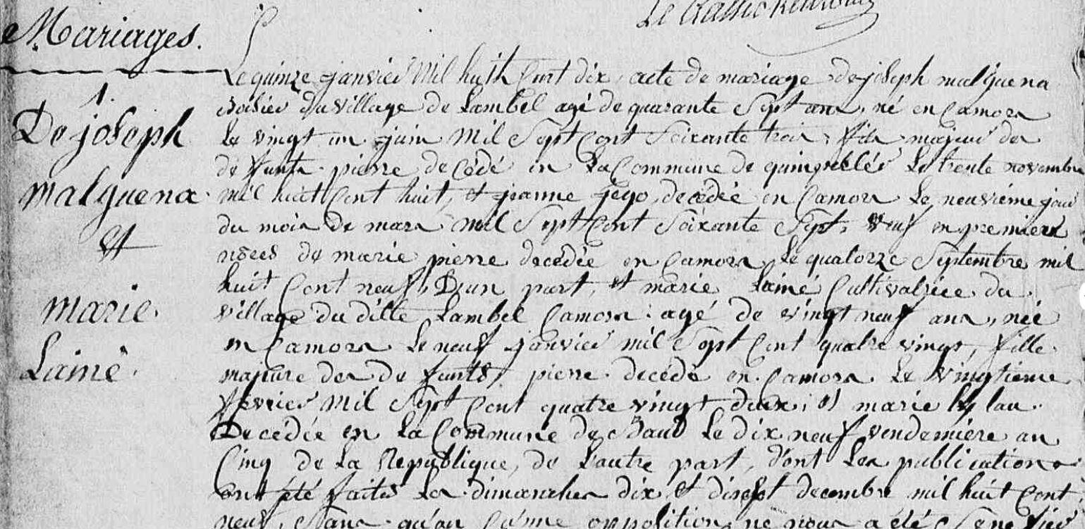 | Mariage MALGUENAC Joseph LAINE Marie - 1810 - Camors - 1 |