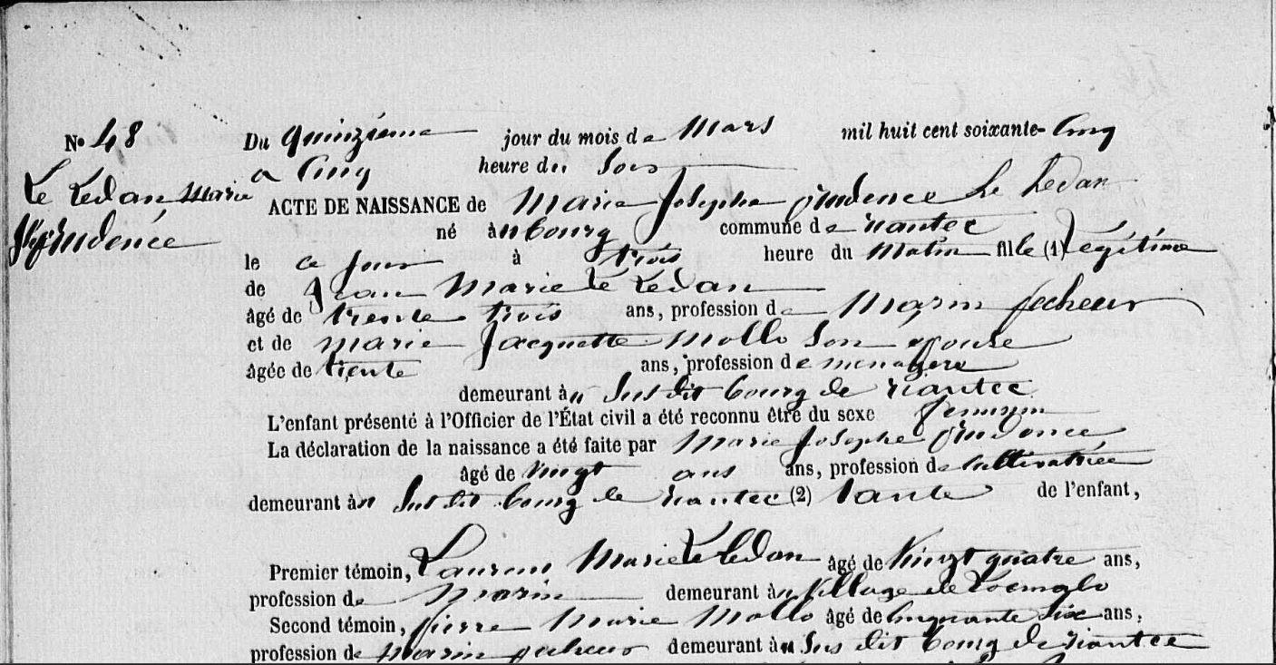 Naissance LEDAN (LE) Marie Joseph Prudence - 1865 - Riantec - 2 |