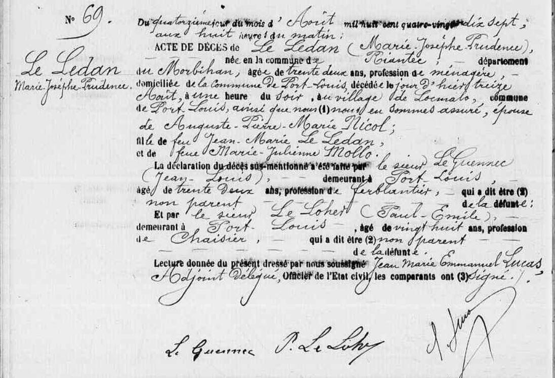 Décès LEDAN (LE) Marie Josephe Prudence - 1897 - Port-Louis |