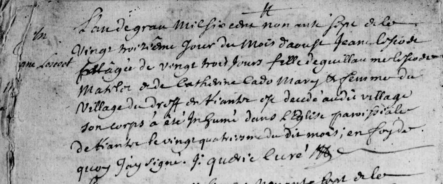 | 3. LESCOËT Jean Naissance : Date : 17/03/1764 Lieu : Riantec (56), Saint Diel Décès : Date : 22/01/1768 Lieu : Riantec (56), Saint Diel à l'âge de 3 ans. |