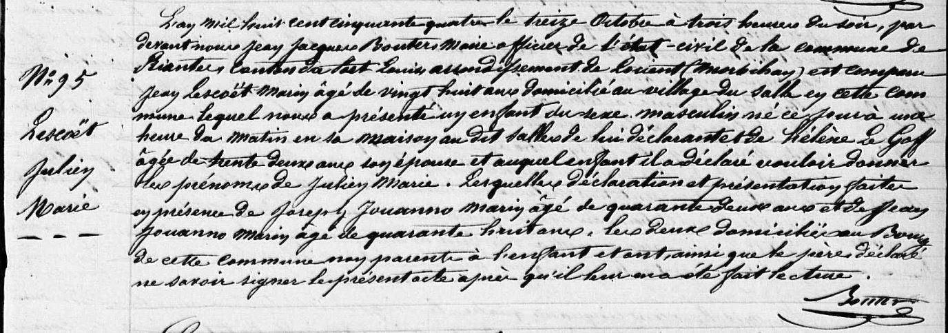 | Naissance LESCOET Julien Marie - 1854 - Riantec |