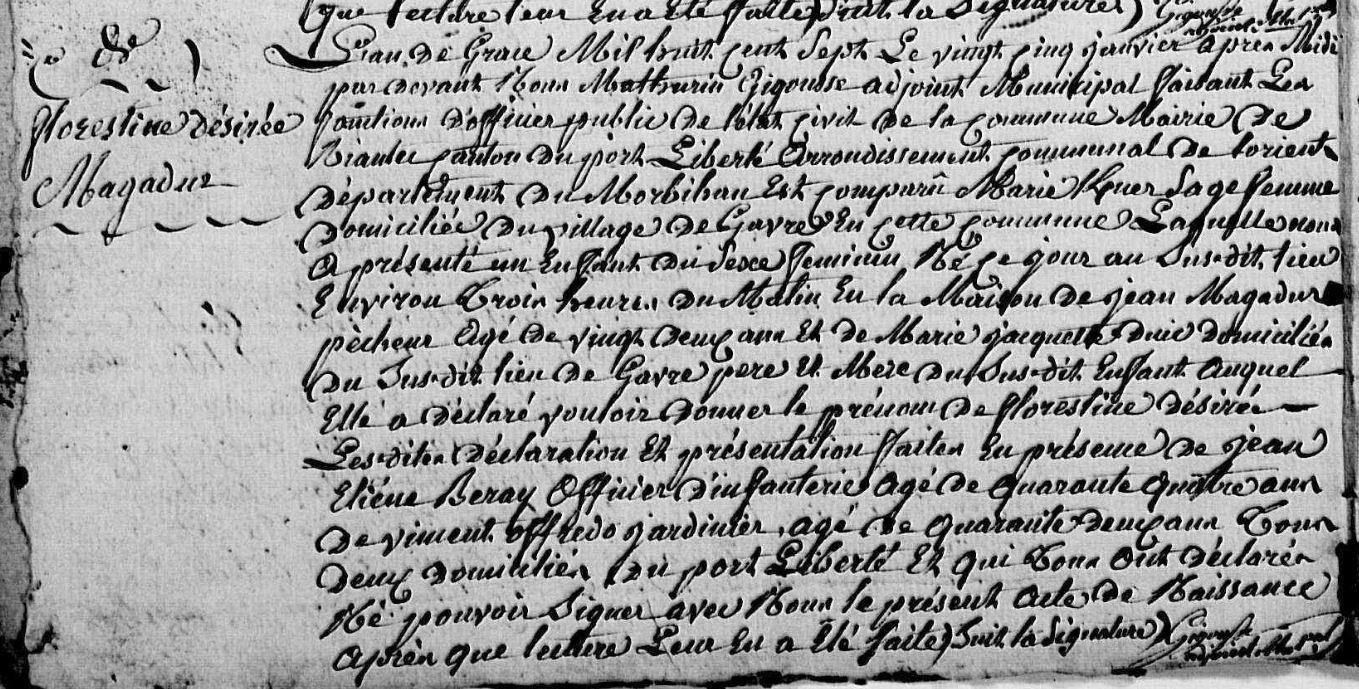 | 1. MAGADUR (LE) Florestine Désirée Naissance : Date : 25/01/1807 Lieu : Riantec (56), Gâvres |