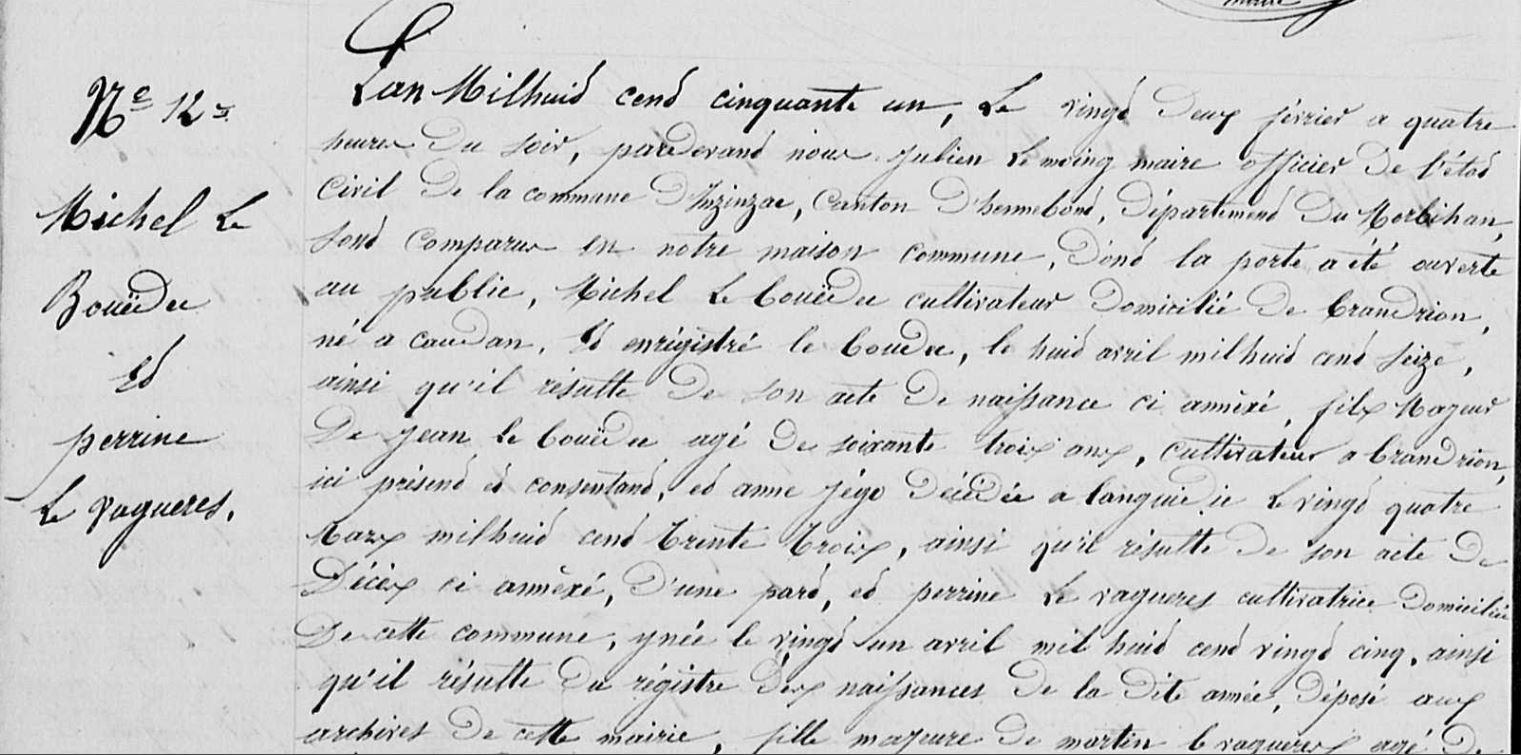 | Mariage : Date : 22/02/1851 Lieu : Inzinzac-Lochrist (56) BOUËDEC (LE) Michel, Cultivateur 4 Il voit le jour à Caudan (56) 08/04/1816 5. |