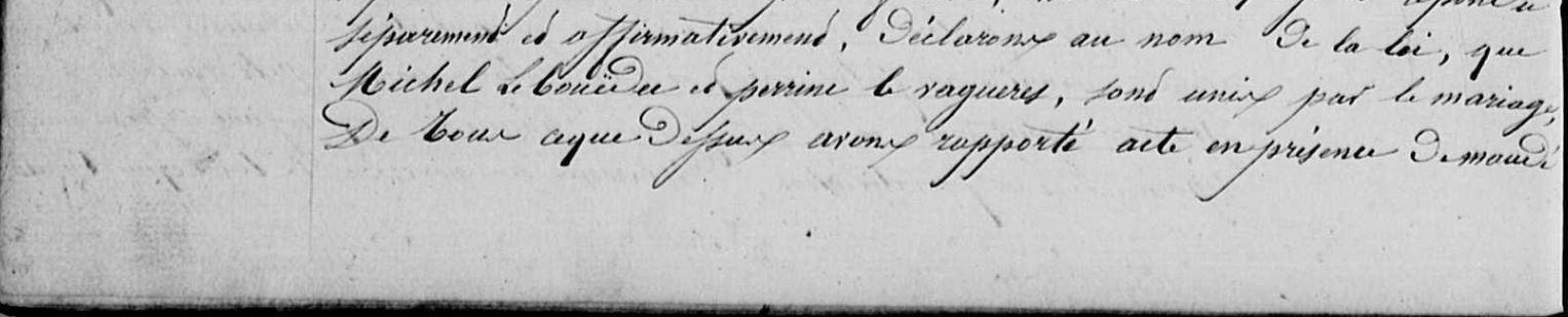 | 4 Note, Union : Michel LE BOUEDEC né a Caudan, et enregistré LE BOUDEC ainsi qu'il résulte de son acte de naissance ci amené ... ... avons interpellé les futurs, leur père et mère de nous déclarer s'il y a identité entre lui et Jean LE BOUEDEC son père, dont le nom a été incorrectement écrit à son acte de naissance, ils nous l'ont tous affirmé sous sermont, ... |