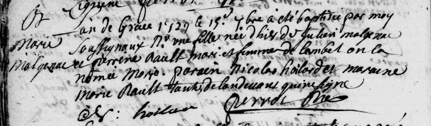 | 7. MAREC (LE) Perrine Naissance : Lieu : Baud (56), Lambel Baud Décès : Date : 15/07/1759 Lieu : Baud (56) |