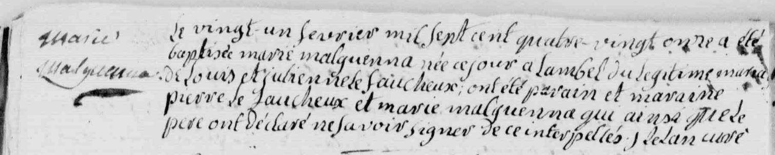 | Enfant(s) de MALGUENAC Anne et de BRIENT Marie : - MALGUENAC Marie Anne (Naissance : 1739 Décès : 1739) - MALGUENAC Vincent (Naissance : 1740) - MALGUENAC Olivier (Naissance : 1742 Décès : 1808) Union 1785 : JOURDAN Catherine, Union 1781 : HELOUËT Anne Enfant(s) de MALGUENAC Anne et de GOURLAVEN (BOURLEVENNE) Jeanne : - MALGUENAC (MARIANA) Jean Louis (Naissance : 1756) - MALGUENAC (MARIANA) Alain (Naissance : 1756) - MALGUENAC Anne Marie (Naissance : 1759 Décès : 1817) Union : GOBIN Jean |