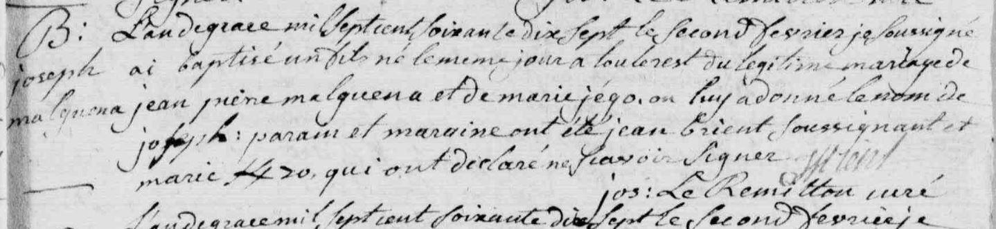 | Baptême MALGUENAC Joseph - 1777 - Camors |