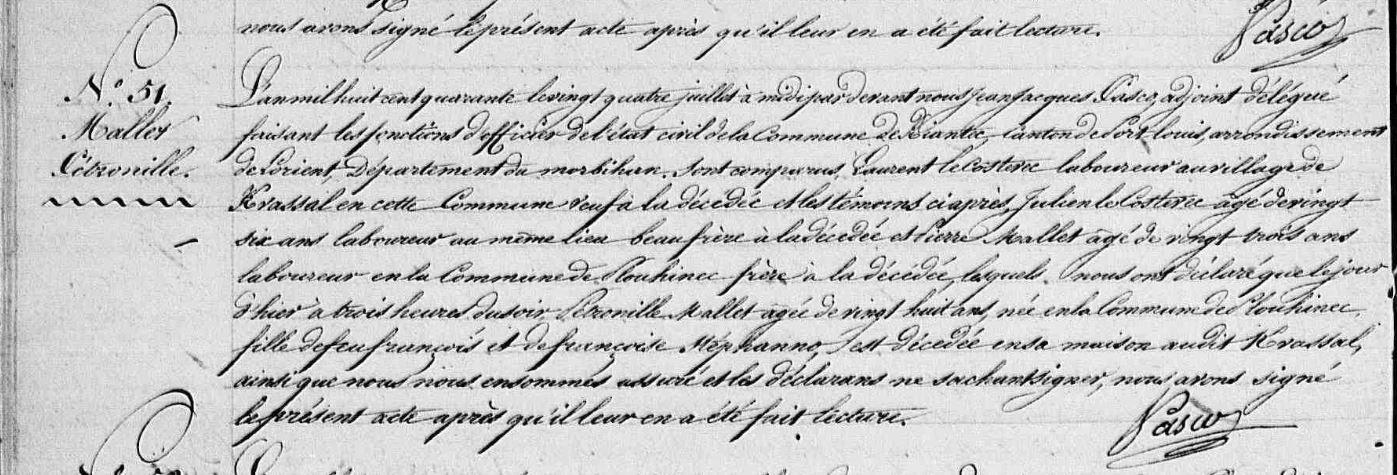 | 1. MALLET Pétronille Naissance : Date : 04/06/1812 Lieu : Plouhinec (56) Union : Date : 03/02/1839 Lieu : Riantec (56) avec COSTEVEC (LE) Laurent. Décès : Date : 23/07/1840 Lieu : Riantec (56), Kervassal à l'âge de 28 ans. |