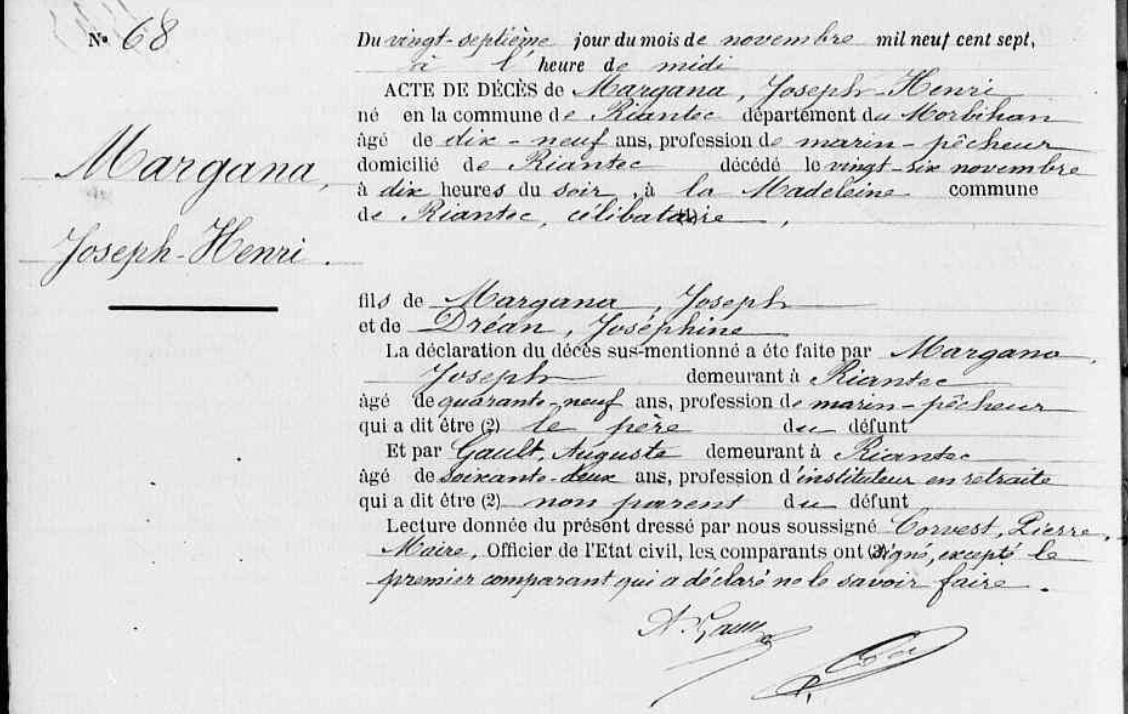 Décès MARGANA Joseph Henri - 1907 - Riantec |
