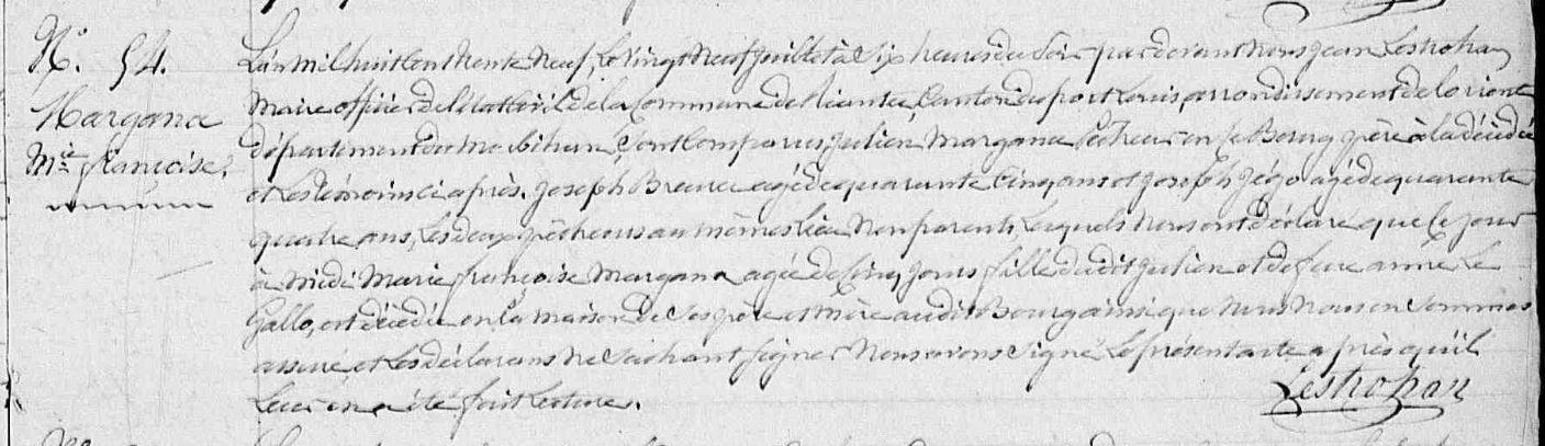 | - MARIENNA (MARGANA) Julien, Sosa 64 (Naissance : 1796 Décès : 1859) Union 1822 : LESSENNE Suzanne, Union 1836 : GALLO (LE) Anne, Union 1855 : GAHINET Jeanne - LESSENNE Suzanne, Sosa 65 (Naissance : 1802 Décès : 1834) |