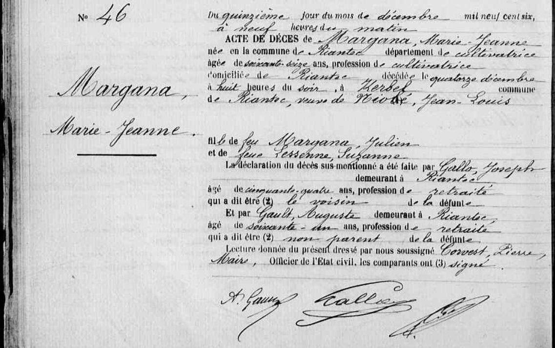 | Décès MARGANA Marie Jeanne - 1906 - Riantec |