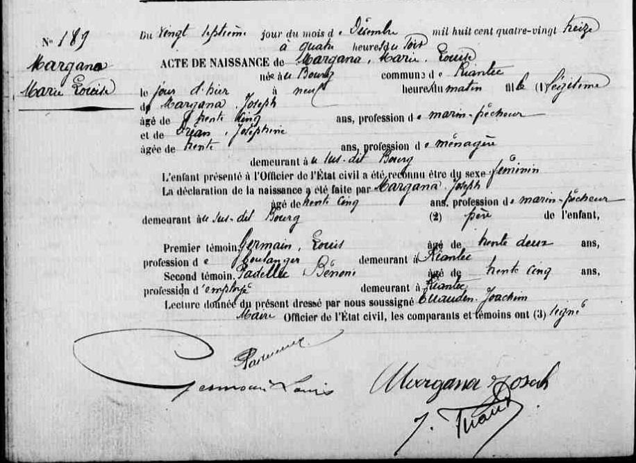 | Elle voit le jour à Riantec (56), Locmiquélic 03/01/1864. Père : MARGANA François, Marin pêcheur Naissance : Date : 05/03/1828 Lieu : Riantec (56), Locmiquélic Décès : 1 Date : 15/10/1870 Lieu : Riantec (56), Locmiquélic à l'âge de 42 ans. Mère : MAITRE (LE) Marie Jeanne, Cultivatrice Naissance : Date : 16/10/1830 Lieu : Riantec (56), Locmiquélic Décès : Date : 17/01/1866 Lieu : Riantec (56), Locmiquélic à l'âge de 35 ans. A sa naissance, ses père et mère étaient âgés de 35 ans et 33 ans. |