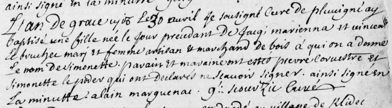 | Baptême MARGUENNA (MARIENNA) Simonette - 1718 - Pluvigner |