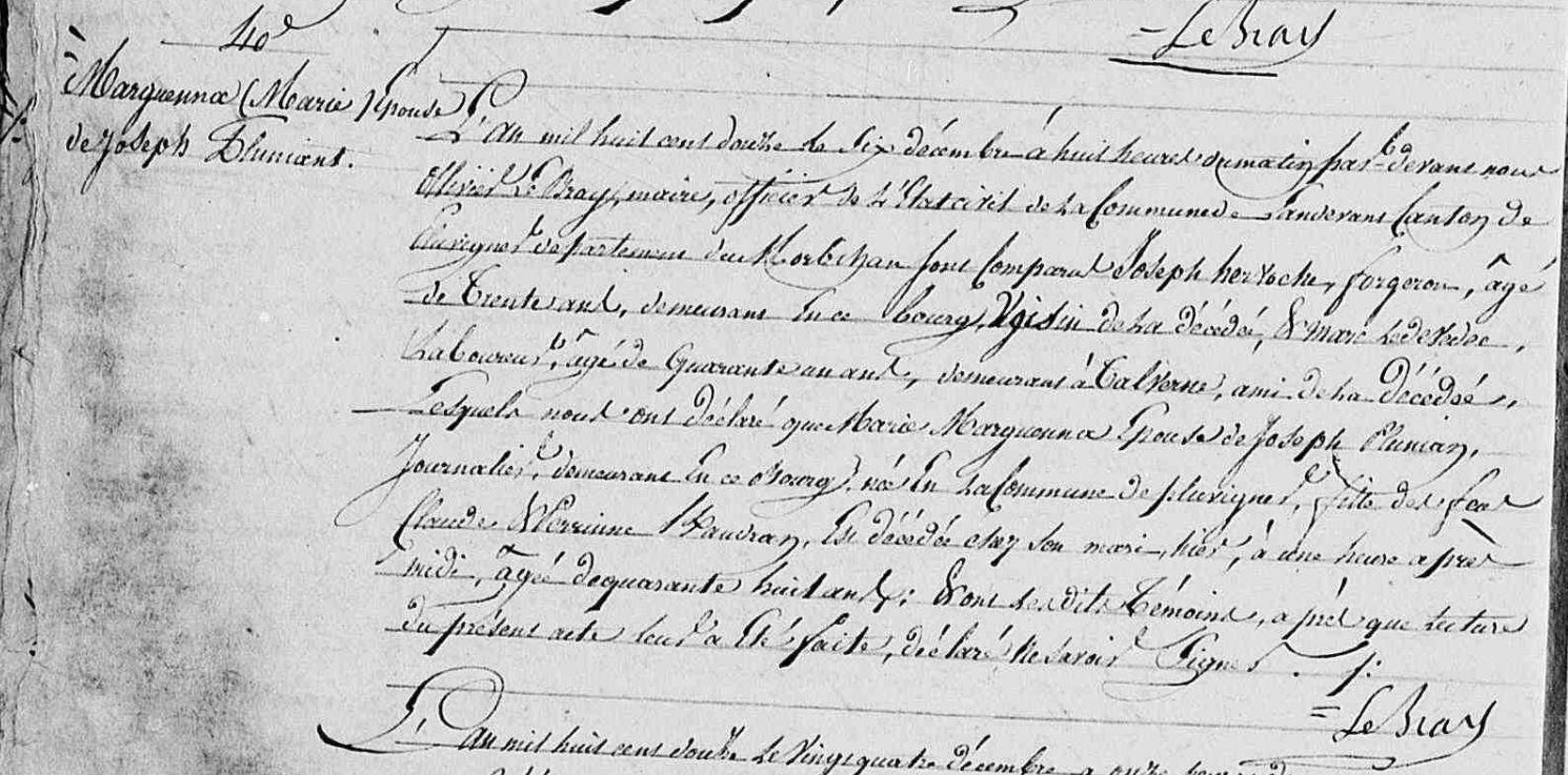 | 1. PLUNIAN Marie Naissance : Date : 25/02/1786 Lieu : Pluvigner (56), Kerporzo Union : Date : 13/02/1809 Lieu : Landévant (56) avec BOBINEC (LE) Paterne. Décès : Date : 12/03/1824 Lieu : Landévant (56), Bourg à l'âge de 38 ans. |