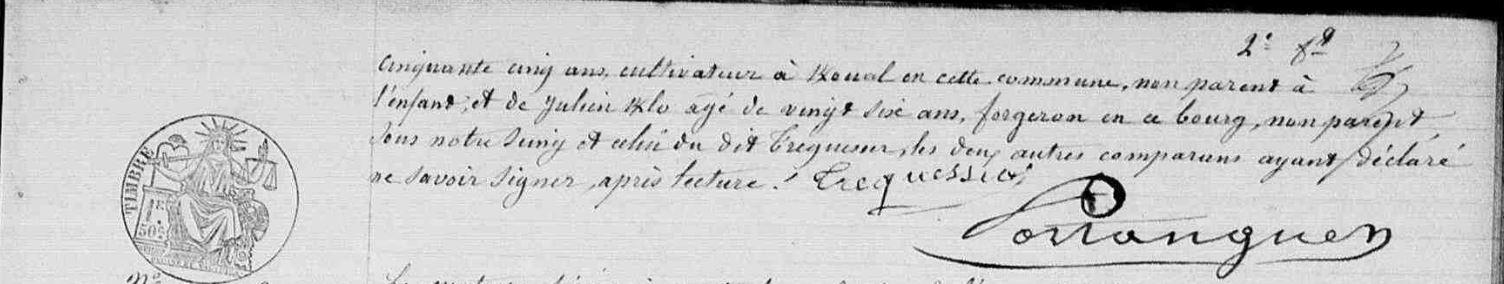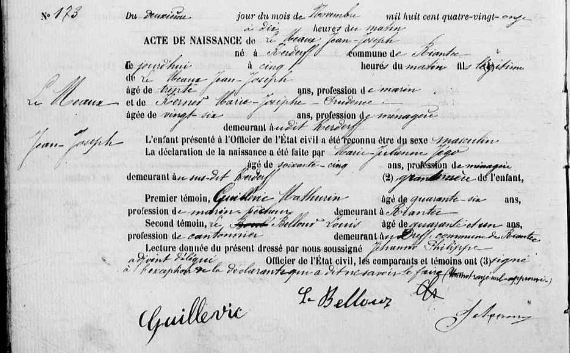 | Il naît 04/04/1850 à Kervignac (56), Talhouët. Signature : Y. Père : MEAUX (LE) Mathurin, Sosa 44, Cultivateur Naissance : Date : 15/09/1816 Lieu : Kervignac (56), Braigno Décès : Date : 10/12/1884 Lieu : Riantec (56) à l'âge de 68 ans. Mère : JEGO Marie Julienne, Sosa 45, Ménagère - Cultivatrice Naissance : Date : 11/11/1826 Lieu : Kervignac (56) Décès : Date : 10/02/1896 Lieu : Riantec (56), Kerverne à l'âge de 69 ans. A sa naissance, ses père et mère étaient âgés de 33 ans et 23 ans. |